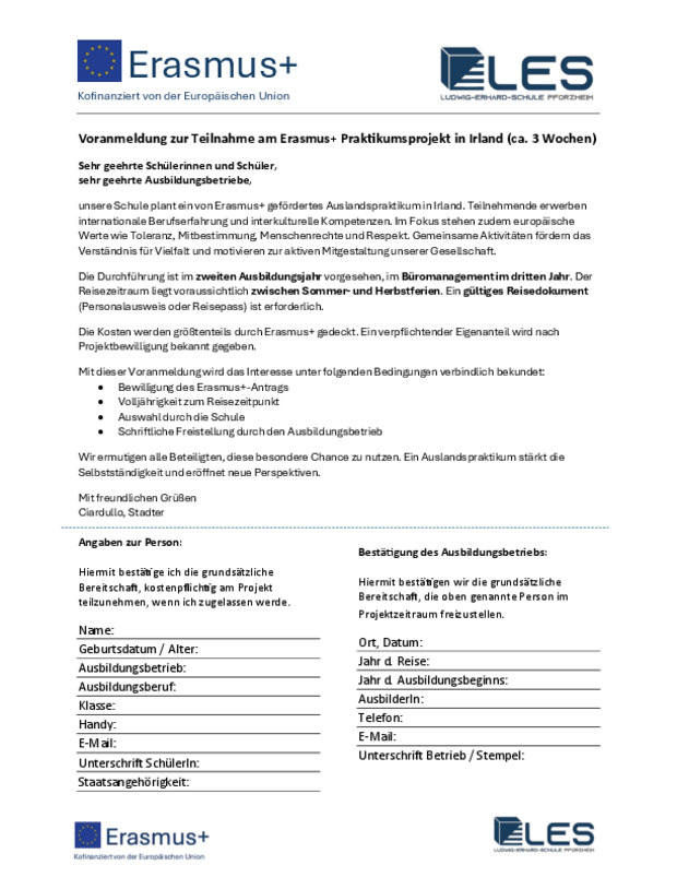 Wir befinden uns aktuell im Erasmus+-Akkreditierungsprozess und möchten nachhaltige Partnerschaften in ganz Europa aufbauen. Unser Ziel ist es, unseren Schülerinnen und Schülern die Möglichkeit zu bieten, hochwertige Praktika im Auslandzu absolvieren, und unseren Lehrkräften berufliche Weiterbildungs- und Austauschmöglichkeiten zu eröffnen.